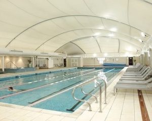 الارتفاع المناسب: يتم تحديد الارتفاع بحيث يسمح بمرور الهواء وتجدده (التهوية الطبيعية) لمنع الشعور بالرطوبة الخانقة داخل المسبح.